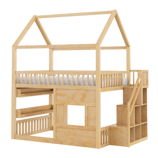L-Shaped Twin Over Full Bunk Bed With Twin Loft, Built In Desk And Slide - Black
