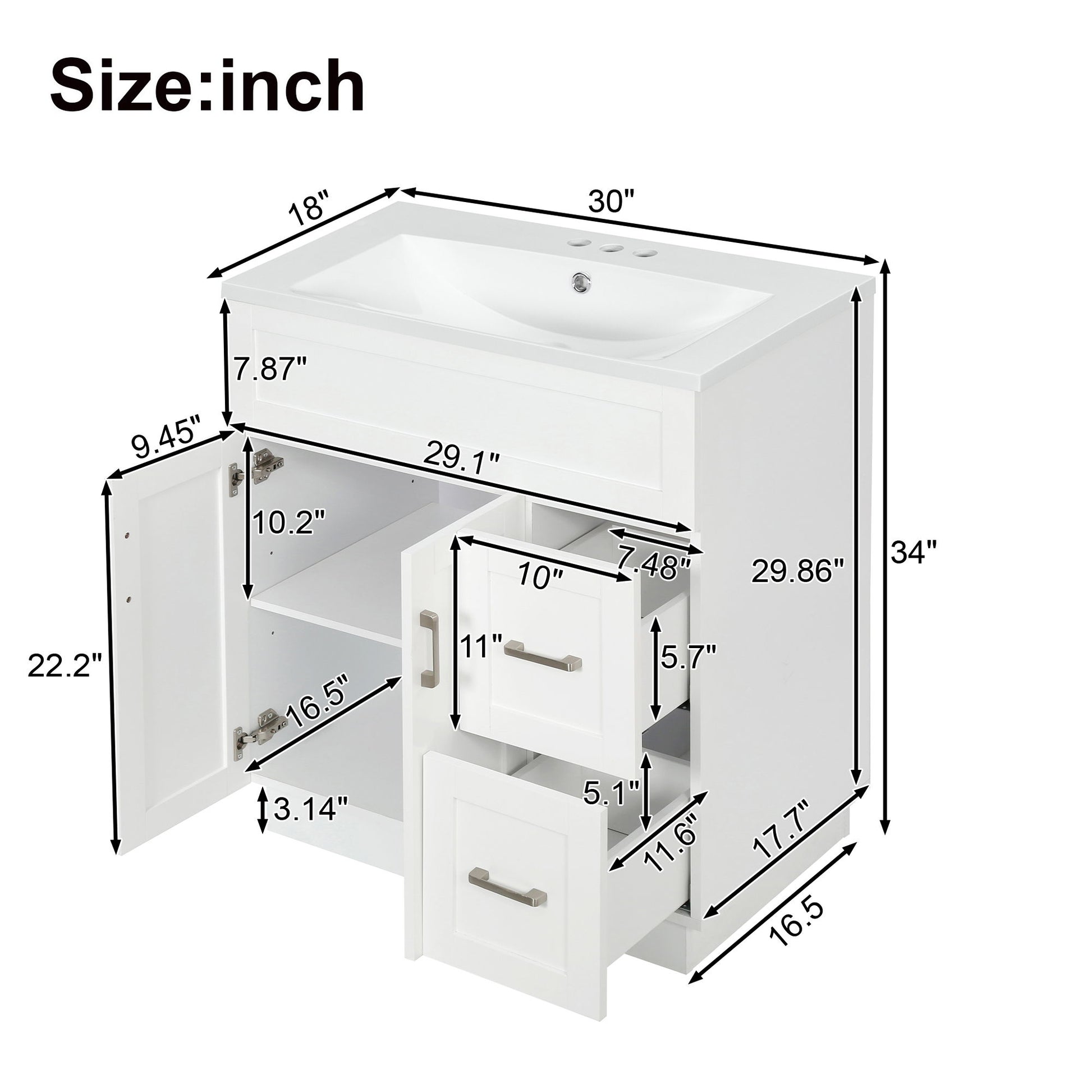 - Maximized Storage for Small to Medium Bathrooms: vanity offers ample space with two doors, two drawers, and adjustable shelves for organized storage.