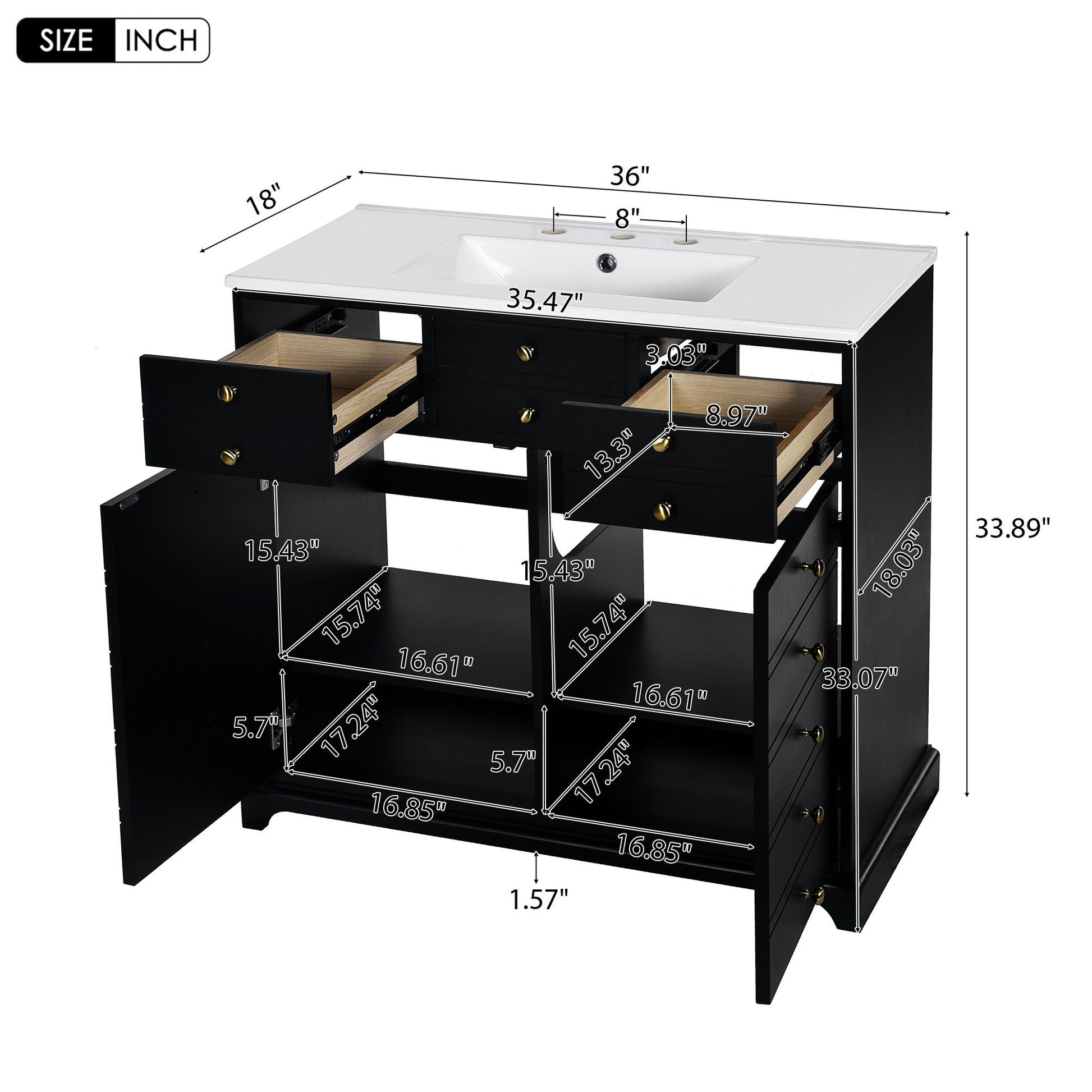36'' Retro Bathroom Vanity With Sink Storage Cabinet, Freestanding With 2 Drawers & Soft-Closing Doors - Black